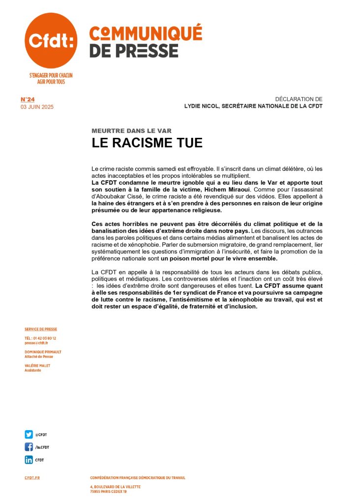 Les syndicats appellent à manifester le plus largement possible ce week-end » Les organisations syndicales alertent depuis des années sur la crise sociale et démocratique qui traverse notre pays. Un politique qui tourne le dos au social et qui crée déclassement, abandon de nos industries et de nos services publics, le passage en force contre la mobilisation historique contre la réforme des retraites, l’absence de perspectives de progrès et la banalisation des thèses racistes, constituent le terreau sur lequel l’extrême droite prospère. »