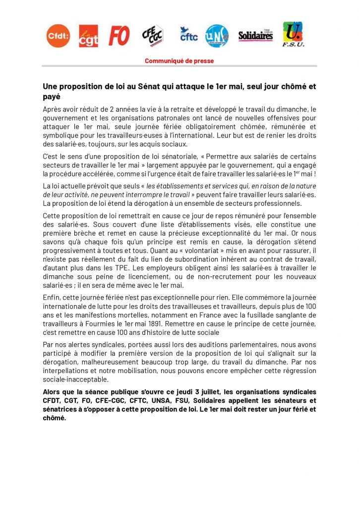Communiqué intersyndical : Une proposition de loi au Sénat qui attaque le 1er mai, seul jour chômé et payé